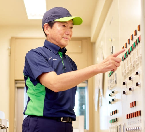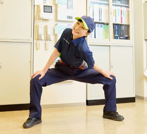 清掃業務や点検業務など、身体を使う作業が多くあります。怪我防止のため、ストレッチを十分に行ってから勤務を開始します。
